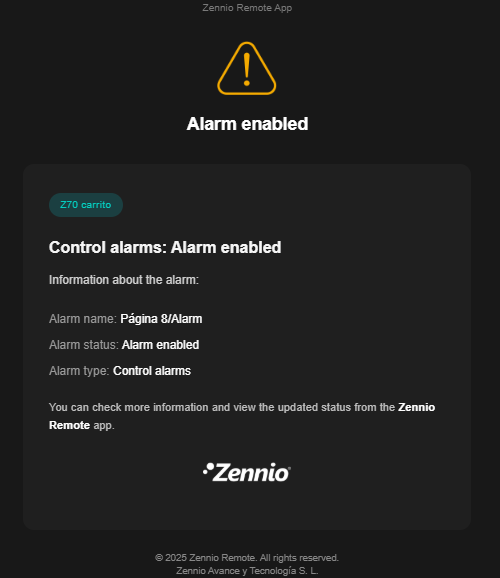 Cuando la opción está activada y se produce una alarma en un dispositivo emparejado, se envía un correo al email asociado a la cuenta con la información principal de la alarma: dispositivo, nombre de la alarma, estado y tipo de alarma.